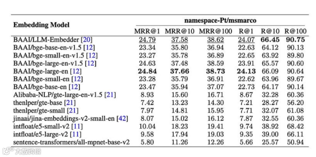 嵌入模型的选择:如下图所示,LLM-Embedder 取得了与 BAAI/bge-large-en 相当的结果,但体积仅为其三分之一。因此,我们推荐选择 LLM-Embedder 来平衡性能和大小。