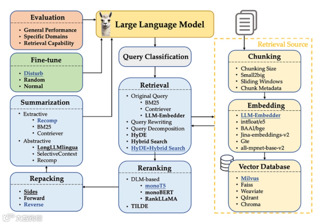 如上图所示,实施 RAG 还需要决定如何将文档分割成块,选择使用哪种嵌入式语义表示,选择合适的向量数据库以高效存储特征,以及找到微调 LLM 的有效方法。