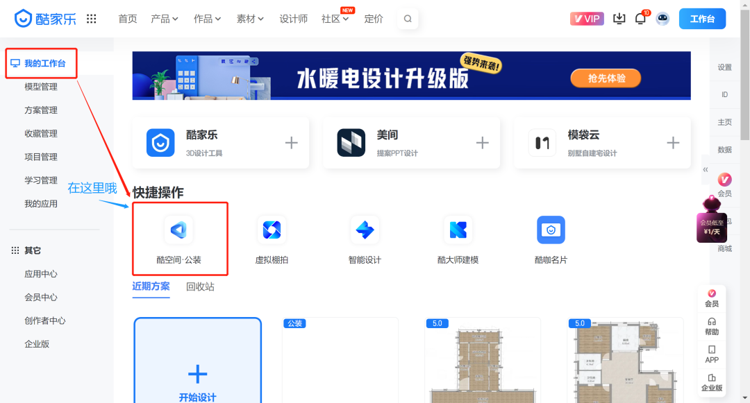 1、在【工作台】板块中点击【我的工作台】,在目录栏右侧找到【酷空间·公装】,点击【酷空间·公装】图标即可进入方案设计页面。