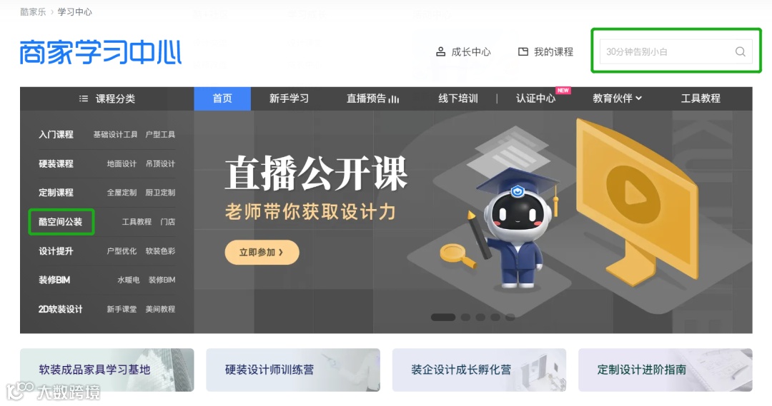 通过搜索框/课程分类直接查找【酷空间】工具课程!