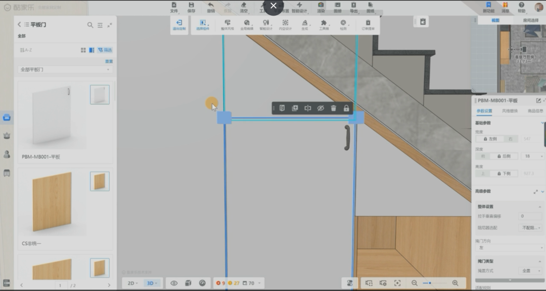 Step1:双击门板把原先的柜体门板删除,根据设计再从组件库-掩门-楼梯门,找到对应方向门板进行摆放并修改尺寸