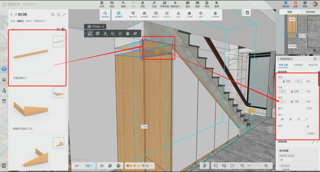 Step4:找到先对应的楼梯柜,产品库-异形柜-楼梯柜-高矮柜,放置在楼梯下方,并在基础参数与高级参数进行尺寸修改