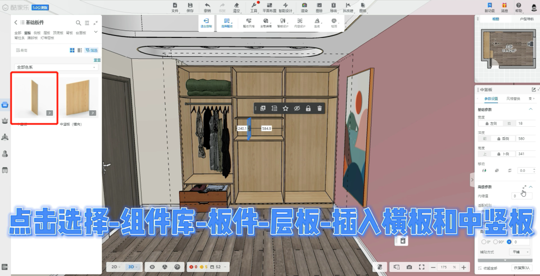 ⑥点击选择-组件库-板件-层板-插入横板-中竖板