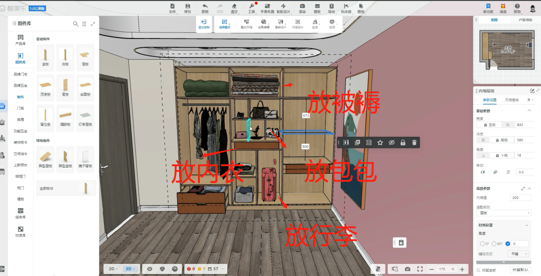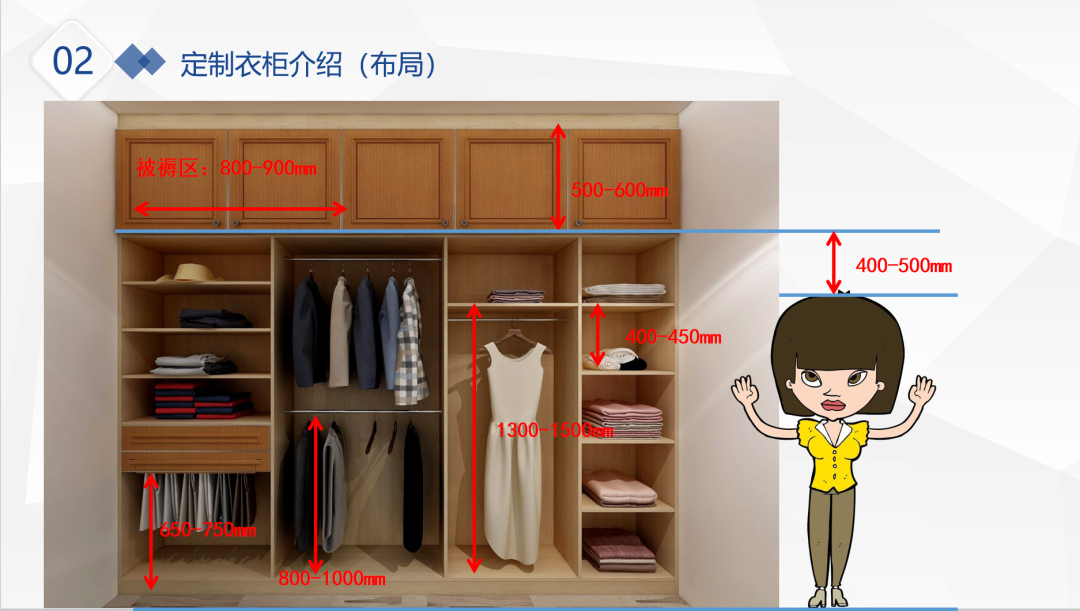 设计前思考对柜体的功能分区,就可以利用层板进行隔开,制作出挂衣区、叠放区、和梳妆区