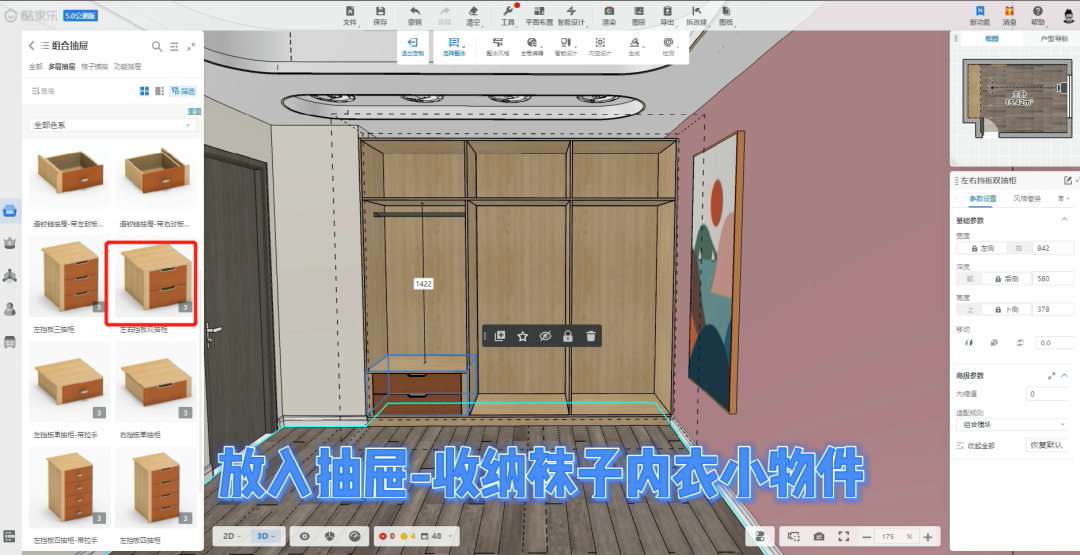 ②选择公共库-点击单元柜-选择万能柜-单列开放侧包顶万能柜18MM侧板并调整参数
