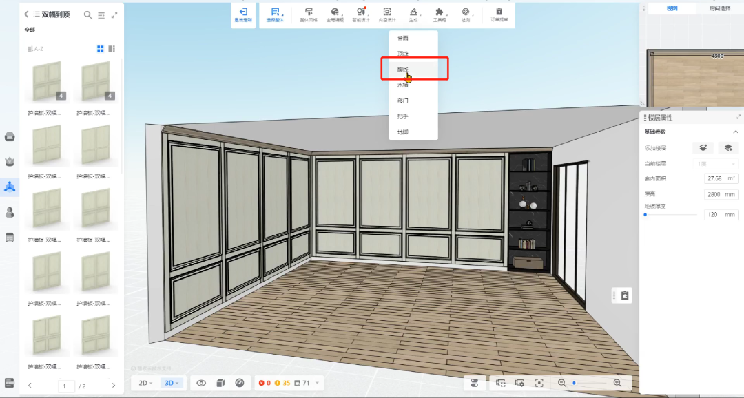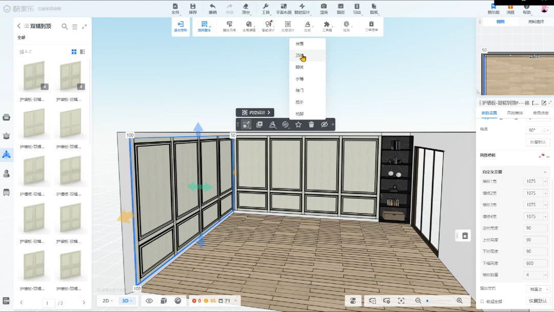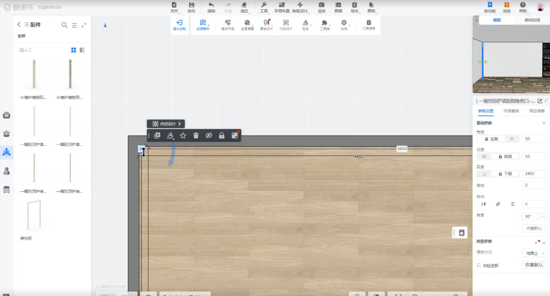 Step1:由于需要在链接的墙体增加护墙板,所以第一步我们先加上收口线,进入全屋家具定制界面,选择护墙板-配件-一幅到顶护墙板阴角收口