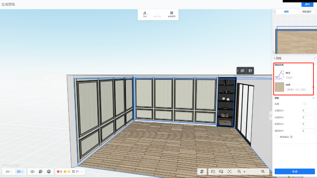Step7:接下来生成脚线,点击工具栏-生成脚线-按住shift框选中需要角线的物体,然后修改样式和材质,点击生成后退出