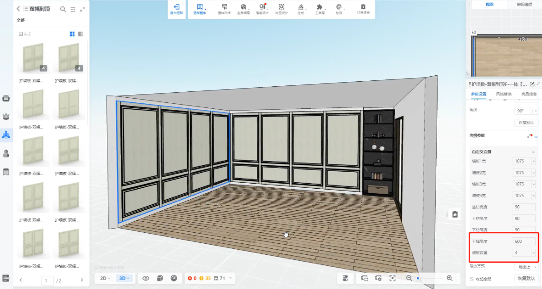 Step4:第二步,添加护墙板,选择双幅到顶共边枋护墙板添加到墙面上,缩放一下大小,然后修改尺寸,高度2600,离地100,护墙板数量填4,下幅高度600