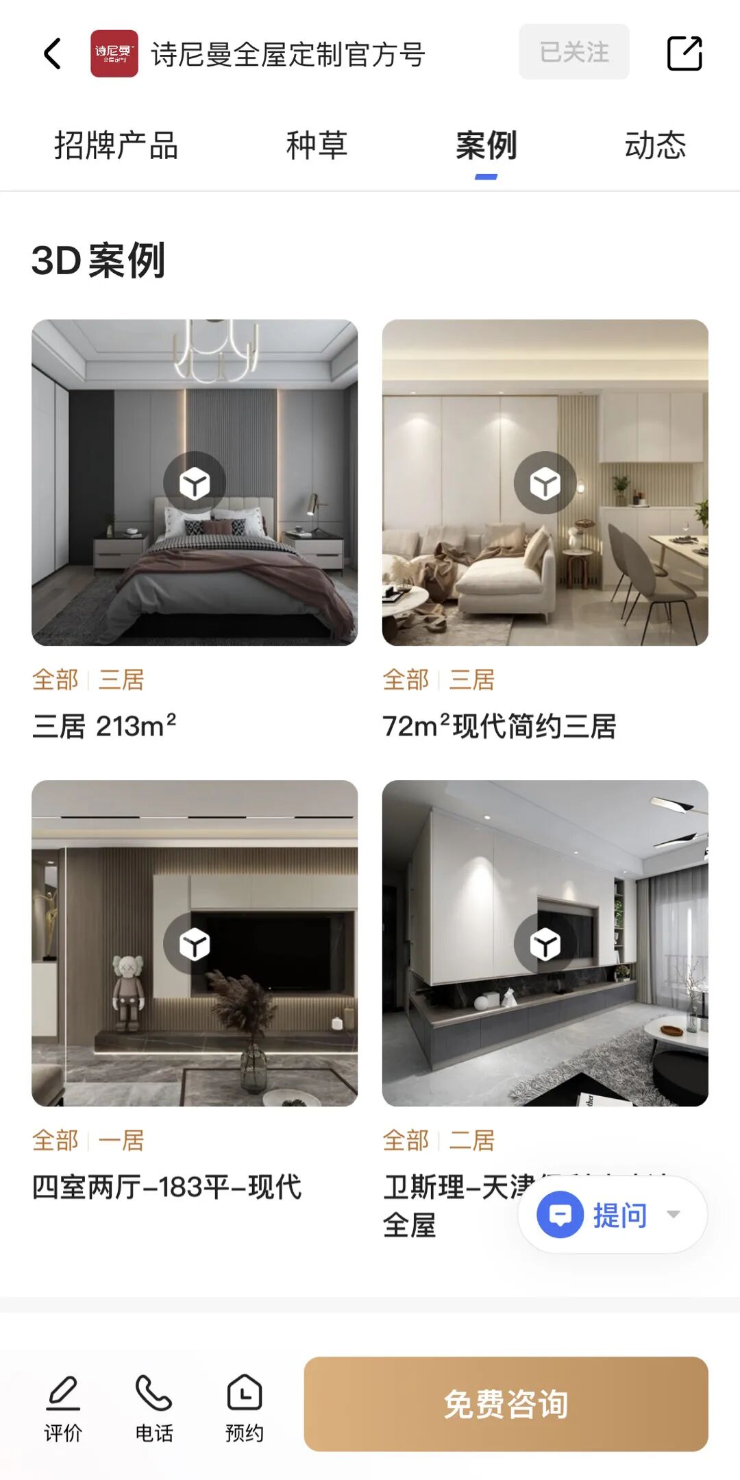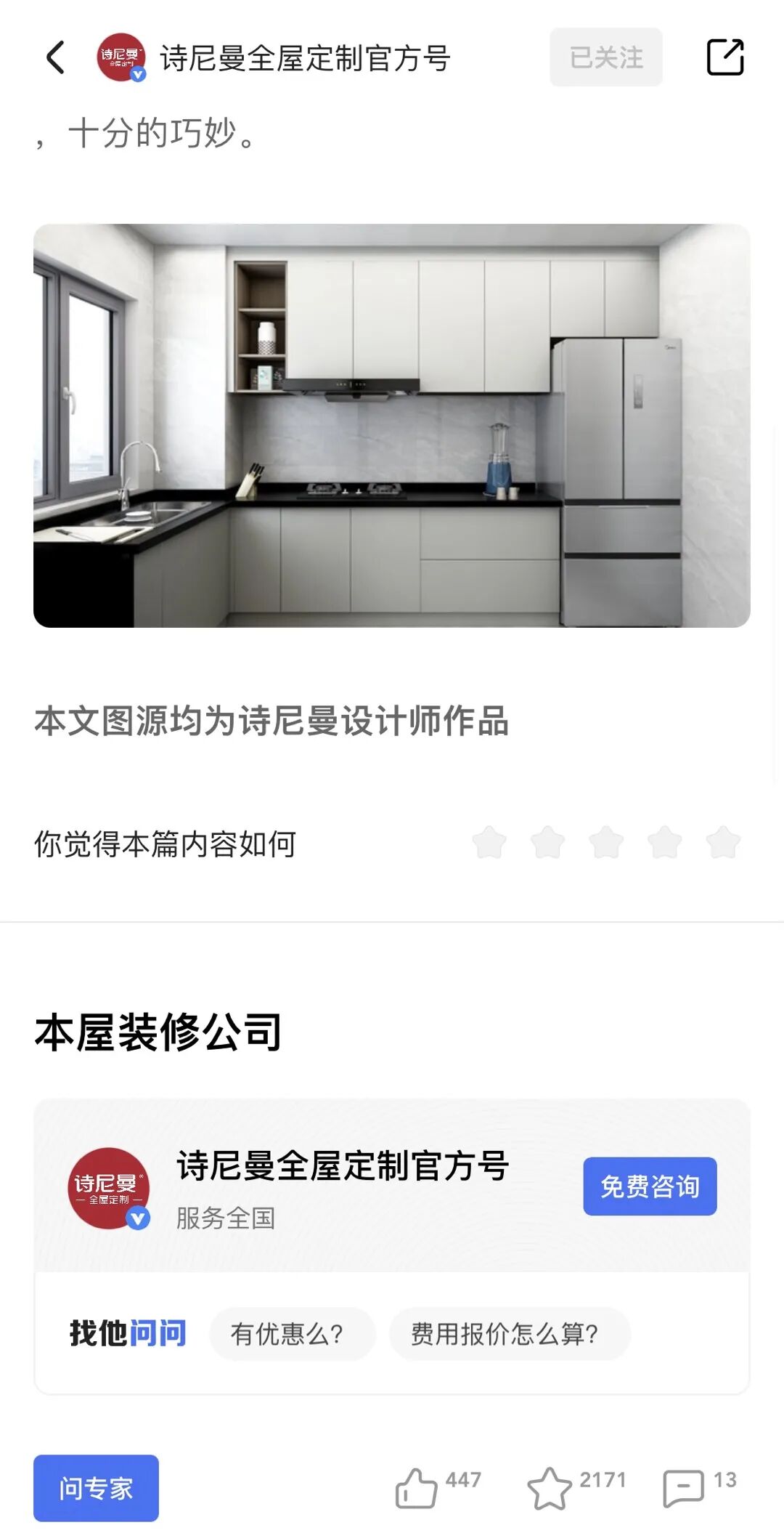 诗尼曼在2020年5月开始以品牌形式全面运营住小帮,当初选择入驻住小帮的一大原因也是酷家乐是住小帮的深度合作伙伴,可以一键同步3D案例、优秀方案到平台上,操作很方便快捷。另外这个平台的人群都是80、90后为主的装修人群,量大且精准,投入产出比比较乐观,所以我们会投入精力去做。