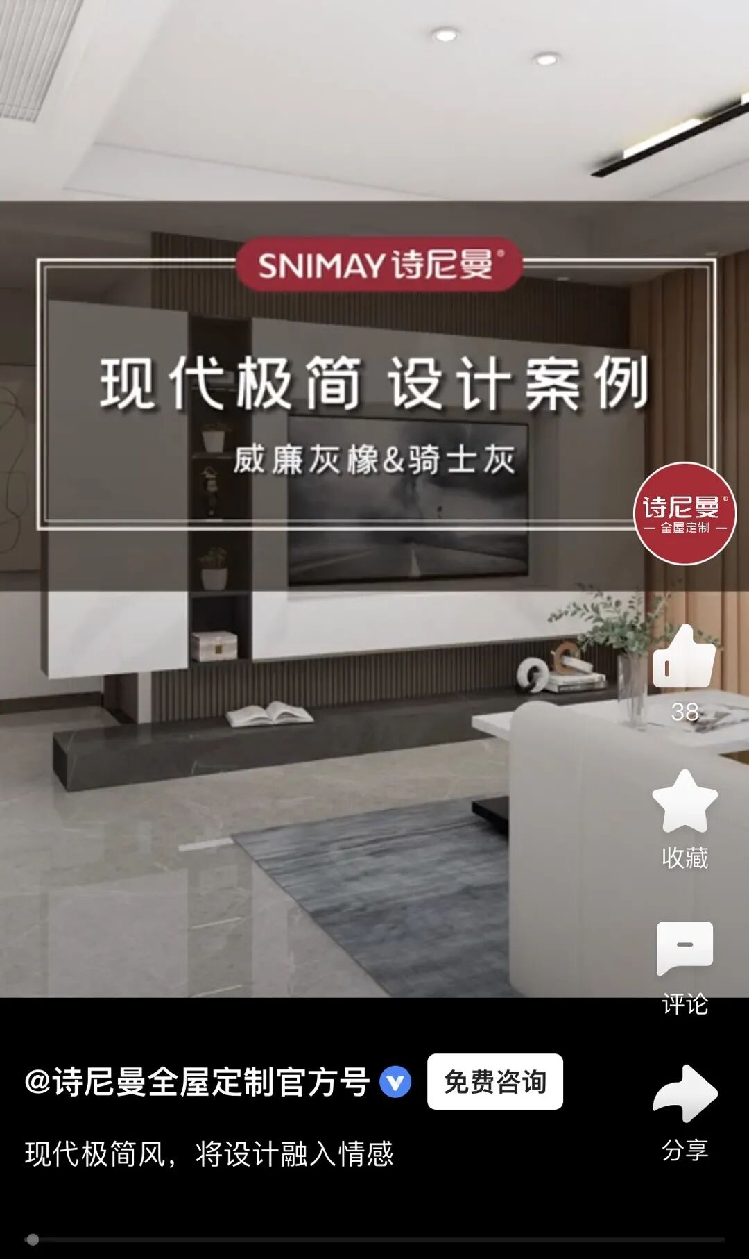 但光这些还是不够的,诗尼曼研发中心、培训中心、设计展示中心每月也会固定上传方案,有新品上线时,针对每款新品还会设计不同风格的全案案例上传到公司内部网盘和分享家平台。最后我们还有新媒体中心,他们会负责外景内容拍摄,内容包括全国客户家的实景采拍,样板间采拍,然后将内容剪辑发布到抖音、视频号平台,并将这些内容也同步给酷家乐运营组去分发到住小帮平台进行营销获客。