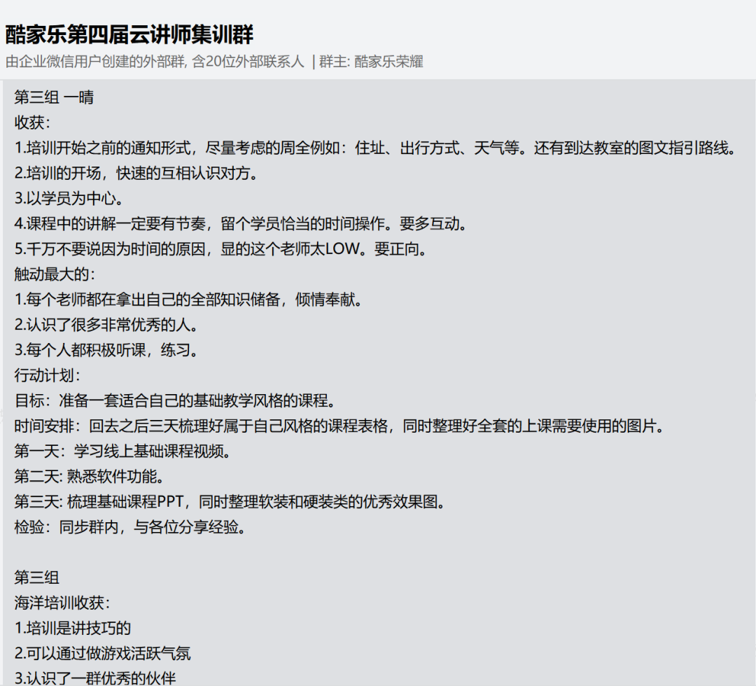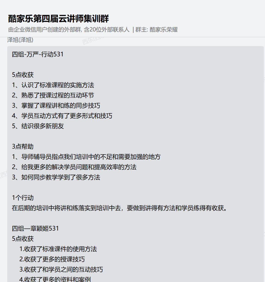 有讲有练才能巩固消化,每节课程之后都安排了相对应的实操练习环节,以此来让云讲师们更好的理解培训的每个节点。学习和练习之后云讲师们也收获颇丰。