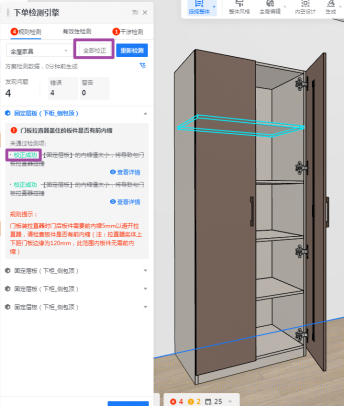 出现检测报错,无需点击层板一块一块设置层板前内缩值,直接在规则检查窗口 点击【全部校正】,检测结果会显示“校正成功”。