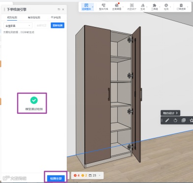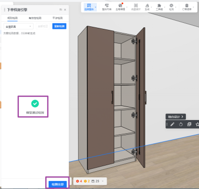最后再在检查窗口点击【检测全部】,检测结果则会显示“模型通过检查”。
