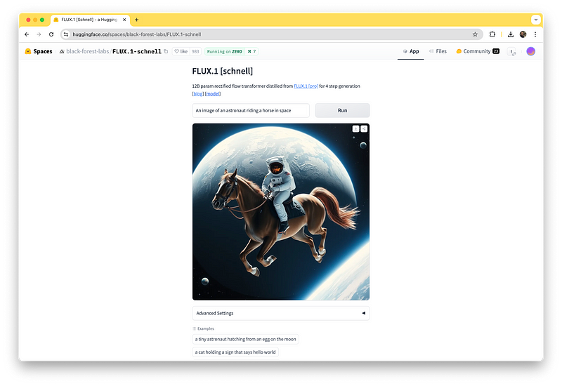 HuggingFace: https://huggingface.co/black-forest-labs/FLUX.1-dev?text=an+image+of+an+astronaut+riding+a+horse+in+space -