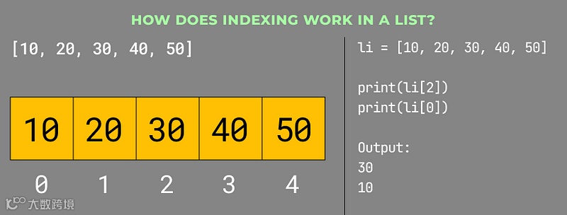 从一组元素中访问单个元素称为索引。索引可以使用方括号,并在方括号内注明索引值(从 0 开始)。