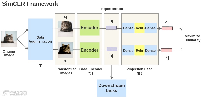 SimCLR框架的思想非常简单。拍摄一张图像,并对其应用随机变换,以获得一对两张增广后的图像𝑥i 和 𝑥j ,该配对中的两个图像都通过编码器以获取图像特征表示。然后应用非线性全连接层来得到最后的特征表示 z。该任务训练的目标是最大化对于相同图像的这两种特征表示zi 和 zj 之间的相似性。