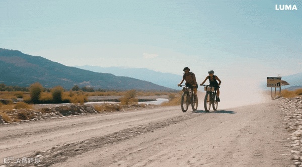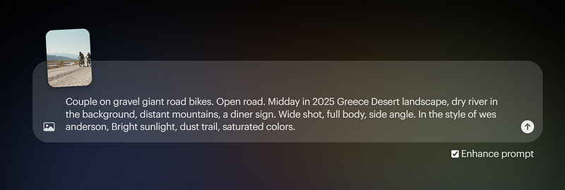 提示:骑着巨型公路自行车的夫妇。开阔的道路。2025 年正午,希腊 沙漠景观,背景为干涸的河流、远山、餐厅招牌。广角镜头,全身,侧角。采用韦斯-安德森(Wes Anderson)的风格,明亮的阳光,尘土飞扬的痕迹,饱和的色彩。
