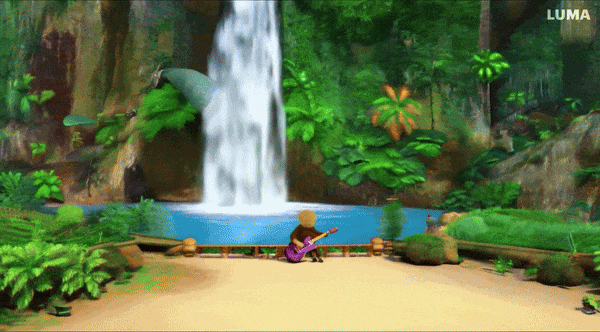 提示:一只戴着墨镜的泰迪熊在美丽的大瀑布前的丛林中弹着电吉他、跳着舞、敲着头