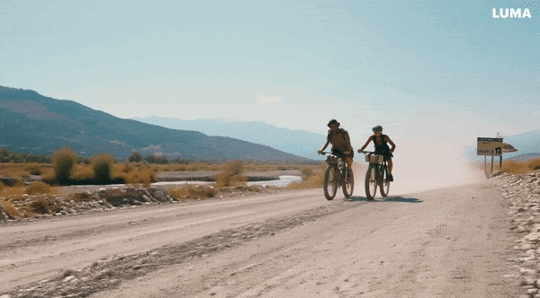 Prompt: Couple on gravel giant road bikes. Open road. Midday in 2025 Greece Desert landscape, dry river in the background, distant mountains, a diner sign. Wide shot, full body, side angle. In the style of wes anderson, Bright sunlight, dust trail, saturated colors.