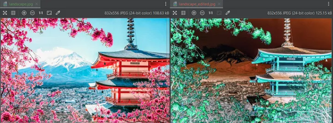 from PIL import Imageimg = Image.open('./landscape.jpg')width, height = img.sizeprint(width, height)new_img = Image.new('RGB', (width, height))for row in range(0, height):for col in range(0, width):(r, g, b) = img.getpixel((col, row))inverted_pixel = (255 - r, 255-g, 255-b)new_img.putpixel((col, row), inverted_pixel)new_img.save("landscape_edited.jpg")