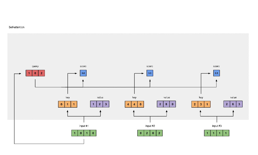 为了获得注意力得分(attention scores),我们用input1的query(红色)和input1,input2,input3的key(橙色)的转置分别计算点积。因此针对input1我们获得了3个注意力得分(蓝色),分别表示input1与所有输入input1,intpu2,intpu3的注意力得分。