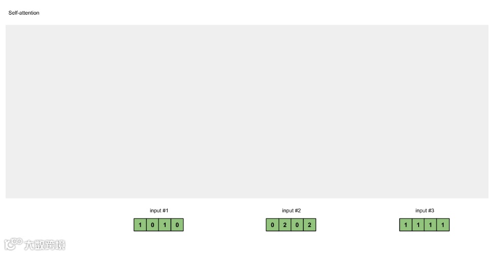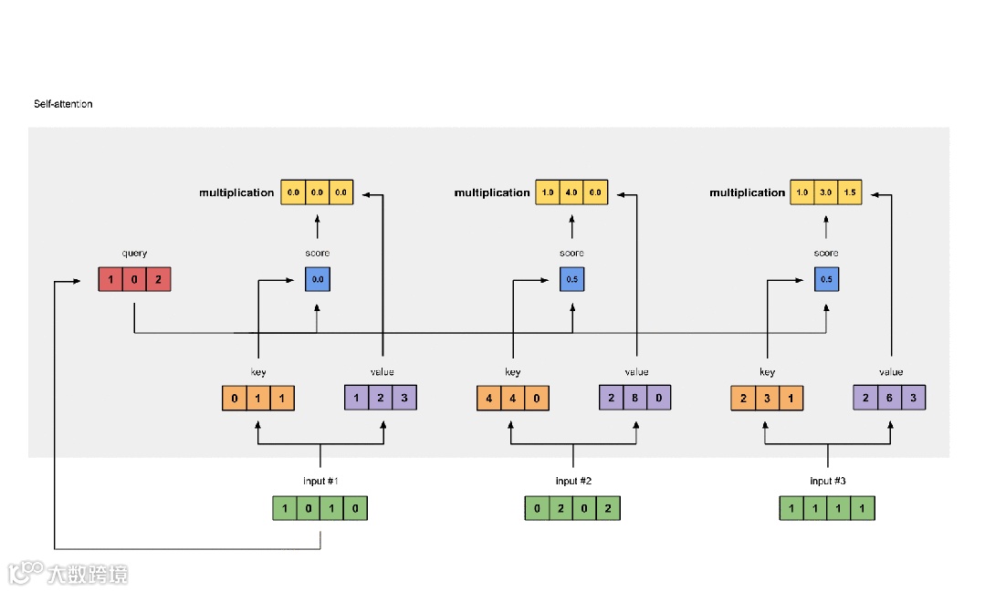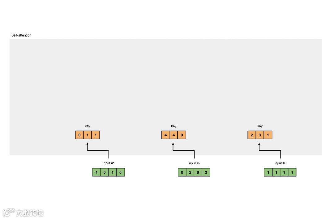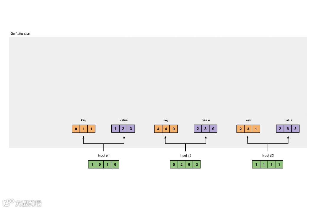 由于我们的input的shape为1×4,假设key、query、value的shape为1×3,因此可以推出与input相乘的三个权重矩阵的shape均为4×3。观察上图,每个输入(绿色)都乘以一组keys的权重、一组query的权重和一组values的权重,然后得到对应的key(橙色),query(红色),value(紫色)。