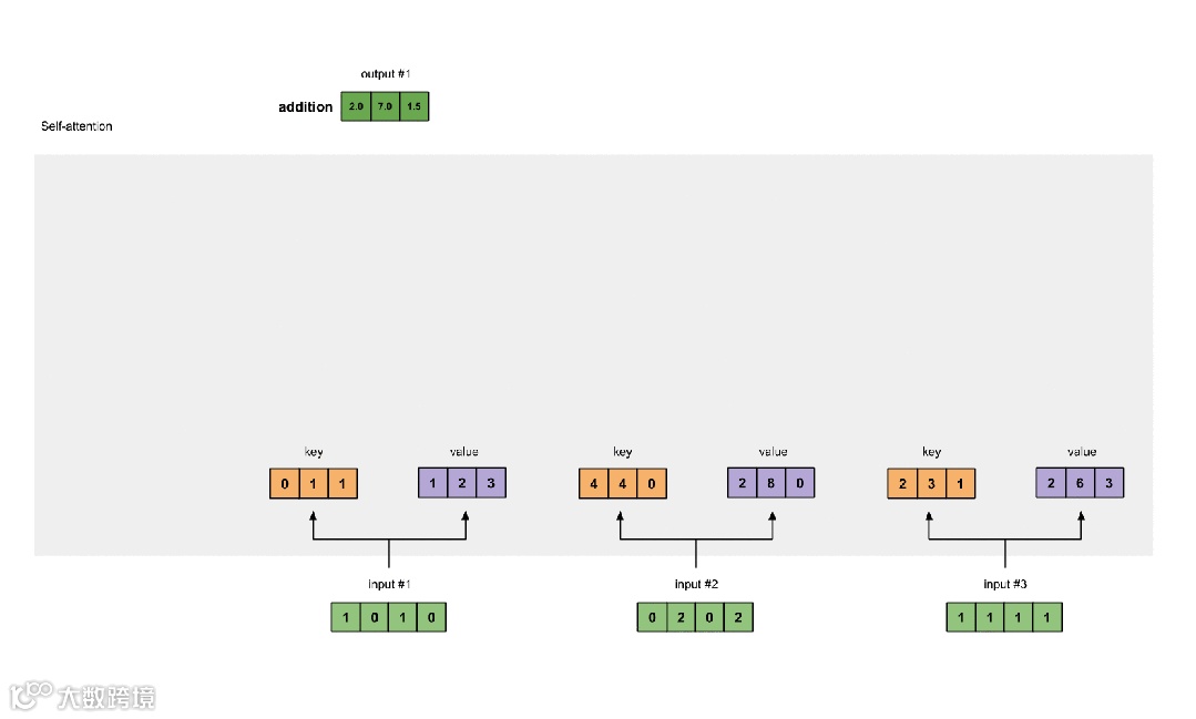 在上一步骤中,我们针对input1的query(红色)产生了三个weighted values(黄色),我们将这三个weighted values 按元素相加,得到我们的输出output(深绿色),表示针对input1中的query与所有输入的key(包含input1)之间的atten score作为对value求和时的权重。