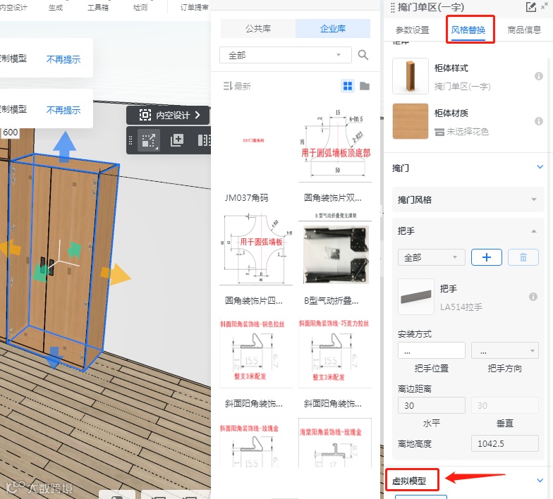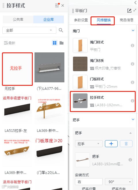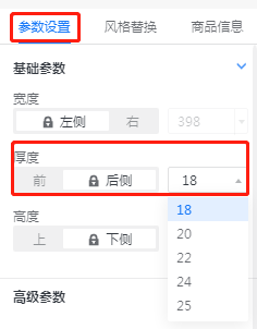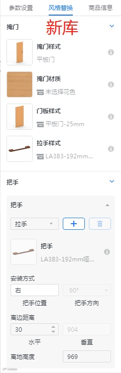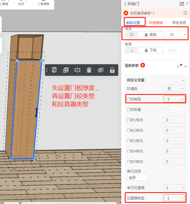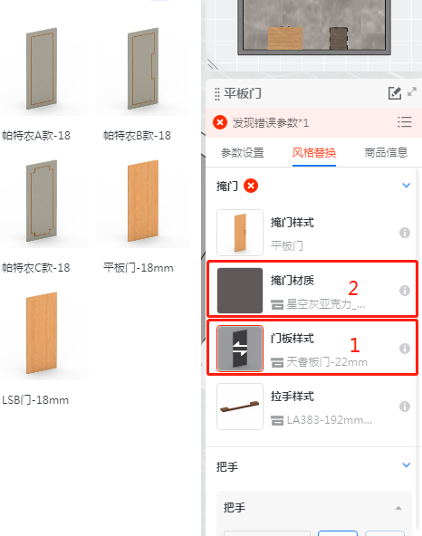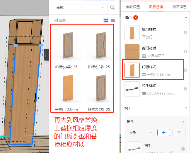 在风格替换门板样式中会显示出相对应可选厚度的门板,最后替换花色,否则会出现报错提示