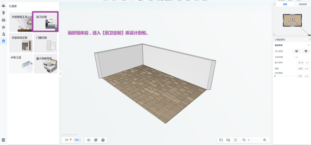 进入行业库,设计衣柜方案进入【全屋家具定制】库画图,设计厨柜方案进入【厨卫定制】库画图。本教程是厨柜下单流程教程,所以进入【厨卫定制】库画图。