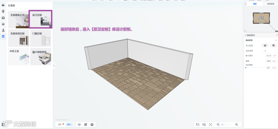 画好墙体,点击空间名称,然后在右边参数里选择房间类型为厨房。