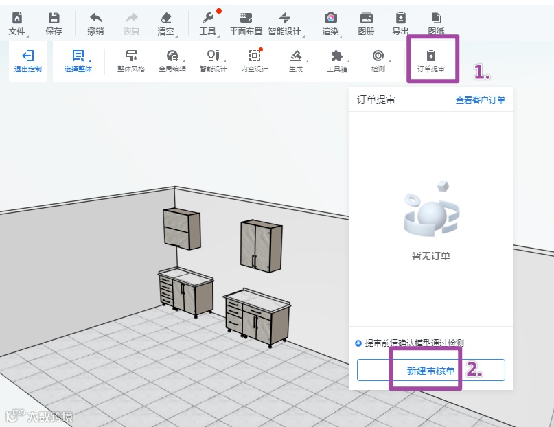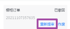 ③已提审的组合柜如需修改,只要提审状态为【待审核】,可以撤回提审单,再重新检测、出图、保存,最后点击【重新提审】即可;