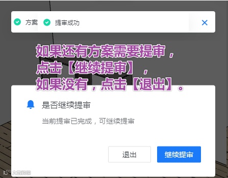 点击确认后,系统还会再弹出一个询问窗口。如果还有方案需要继续提审,点击【继续提审】,如果没有,点击【退出】即可。