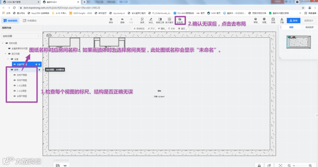 进入编辑视图界面,检查每个视图的标尺、结构是否有误。如有错误,返回设计界面修改模块;如需要增加标尺,在界面上方的工具栏点击标注进行手工标尺即可;确认标尺、结构无误后,在工具栏点击【去布局】。