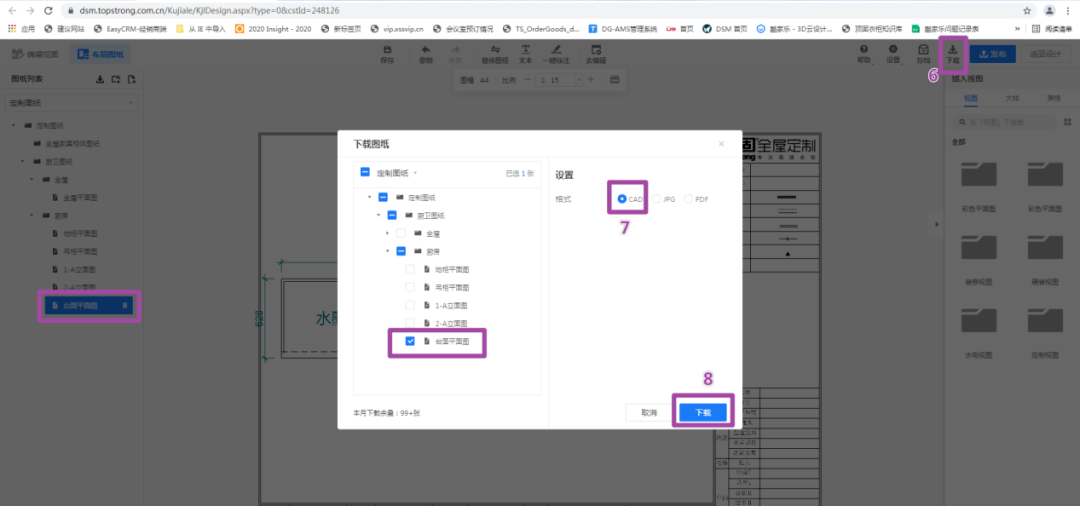 ②酷家乐厨柜台面需另附具体台面铣型图,可下载酷家乐台面CAD图纸模板进行二次编辑再上传下单。导出台面CAD图纸步骤如下图所示: