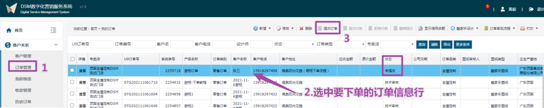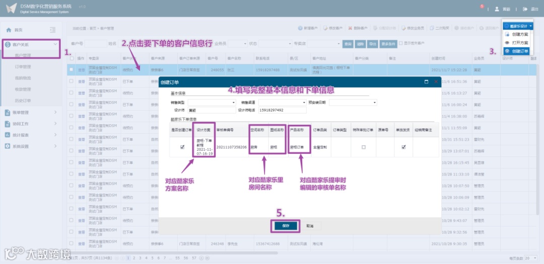 返回DSM系统,在客户管理界面选中要下单的客户信息行,然后在界面上方菜单栏点击【酷家乐设计】,下拉选项中点击【创建订单】弹出创建订单窗口;接着在创建订单窗口填写完整基本信息,勾选酷家乐提审的方案(可多选),选择订单类型,点击保存,完成创建订单。创建订单完成后,客户状态是【已下单】,订单会在订单管理界面显示。
