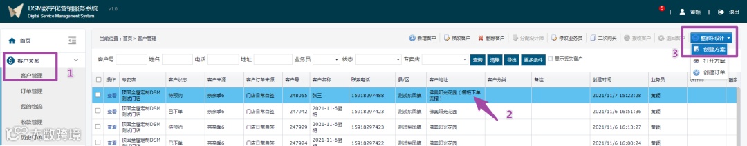 2.1通过DSM进入酷家乐创建方案:在DSM客户管理界面点击要创建方案的客户信息行;在界面上方菜单栏点击【酷家乐设计】下拉选项中的【创建方案】,此时浏览器会自动跳转到酷家乐界面。