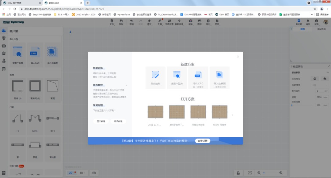 ①建议通过DSM进入酷家乐创建方案,否则酷家乐方案不会自动关联客户,下单过程中容易出现问题。