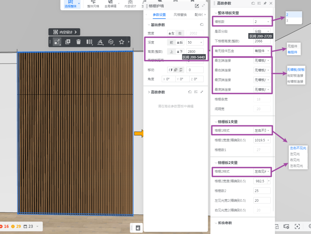 左右见光:选择此选项,护墙板左右各预留19mm间隔;