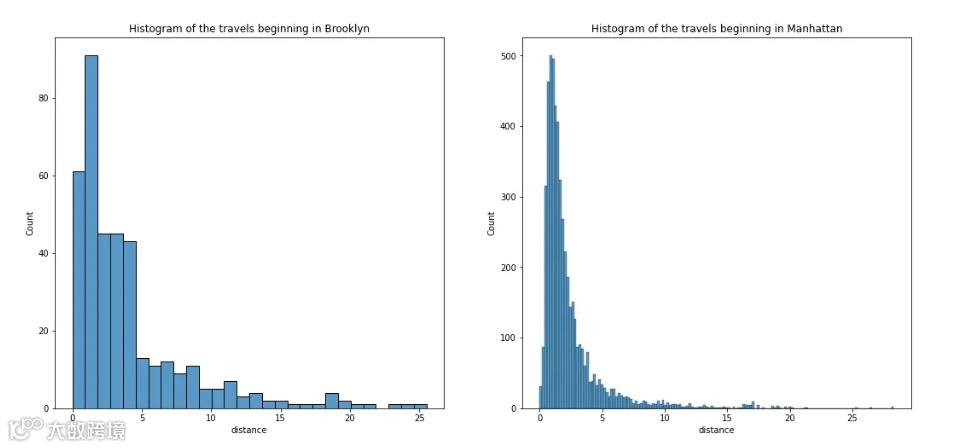 # Histograms# Plot 1g1 = sns.histplot(data=df_bklyn, x='distance', ax=my_grid[0])# Title of the Plot 1g1.set_title('Histogram of the travels beginning in Brooklyn')# Plot 2g2 = sns.histplot(data=df_mhtn, x='distance', ax=my_grid[1])# Title of the Plot 2g2.set_title('Histogram of the travels beginning in Manhattan');