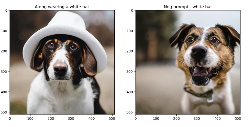 ## Image without neg promptimages = [None, None]images[0] = prompt_2_img(prompts = ["A dog wearing a white hat"], neg_prompts=[""],steps=50, save_int=False)[0]images[1] = prompt_2_img(prompts = ["A dog wearing a white hat"], neg_prompts=["White hat"],steps=50, save_int=False)[0]## Plotting side by sidefig, axs = plt.subplots(1, 2, figsize=(12, 6))for c, img in enumerate(images):axs[c].imshow(img)if c == 0 : axs[c].set_title(f"A dog wearing a white hat")else: axs[c].set_title(f"Neg prompt - white hat")