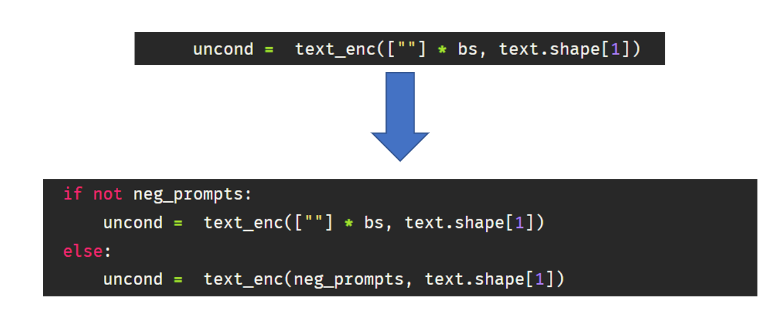 让我们从导入所需的库和辅助函数开始。所有这些已经在本系列前面的几个组件部分中使用和解释过了,这里就不再累述,我们直接从函数prompt_2_img 开始讲起。 现在,我们将通过传递一个额外的参数neg_prompts来更改prompt_2_img函数。反向文本提示的工作方式是在进行采样时使用用户指定的文本来替代之前空字符串进行条件嵌入(uncond)。原理如下: