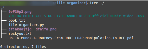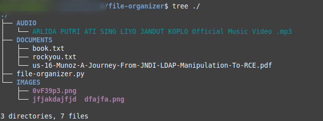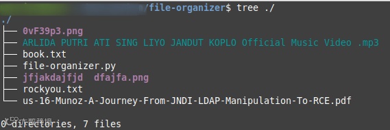 def organizeDir():for item in os.scandir():#just looking for file, skip the directoryif item.is_dir():continuefilePath = Path(item)fileType = filePath.suffix.lower()directory = pickDir(fileType)#just skip, if the file extension not defined.if directory == None:continuedirectoryPath = Path(directory)#make new directory if the category's directory not found.if directoryPath.is_dir() != True:directoryPath.mkdir()filePath.rename(directoryPath.joinpath(filePath))