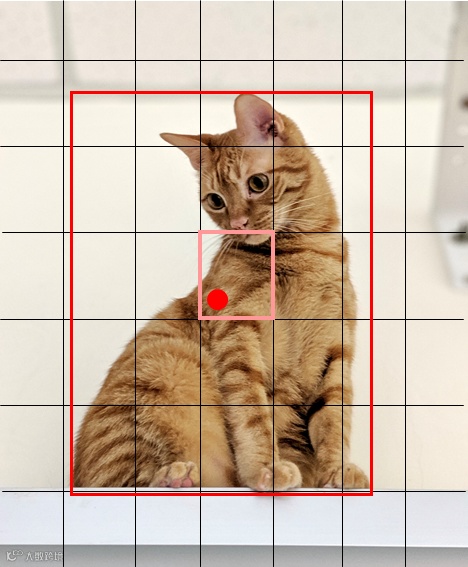 如下图所示,预测到猫咪的bounding box中心点位于粉红框的网格内,则该网格会负责预测这只猫咪.