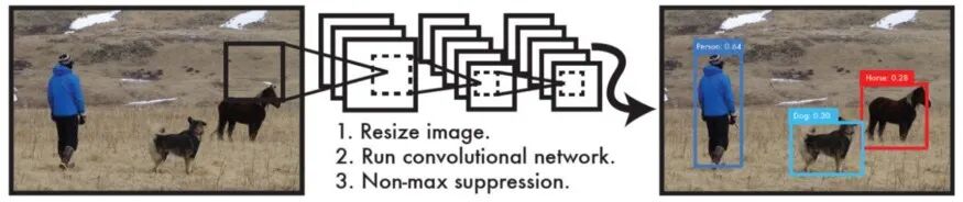 下图所示为模型预测的过程:划分grid cell, 预测bounding box以及class,对bounding box 进行NMS,筛选后的bounding box与class结合后输出结果.