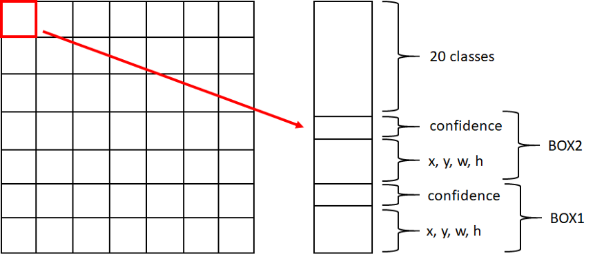首先将输入的图像切分成7X7的网格(grid cell),每个网格负责预测2个bounding box以及输出预测每个类别的概率.论文中采用的数据集为PASCAL VOC,该数据集一共有20个类别.
