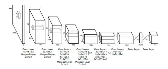 YOLOv1的模型架构参考GoogleNet,一共有24个卷积层,2个全连接层,激活函数为Leaky ReLU,最后一次则是采用Linear activation.