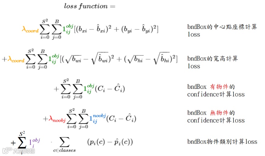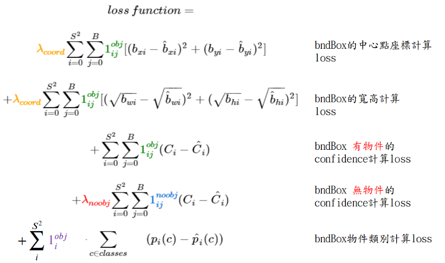 为gt框的中心点坐标, 为预测框的中心点坐标 为第i个网格中第j个bounding box是否有匹配到gt中的标记框.若有匹配,表示该gt标记框与该预测框有最大IOU,此时该bounding box负责检测该物体,此时 为gt框的宽和高, 为预测框的宽和高 使模型着重于物体定位能力