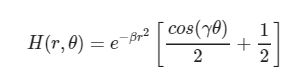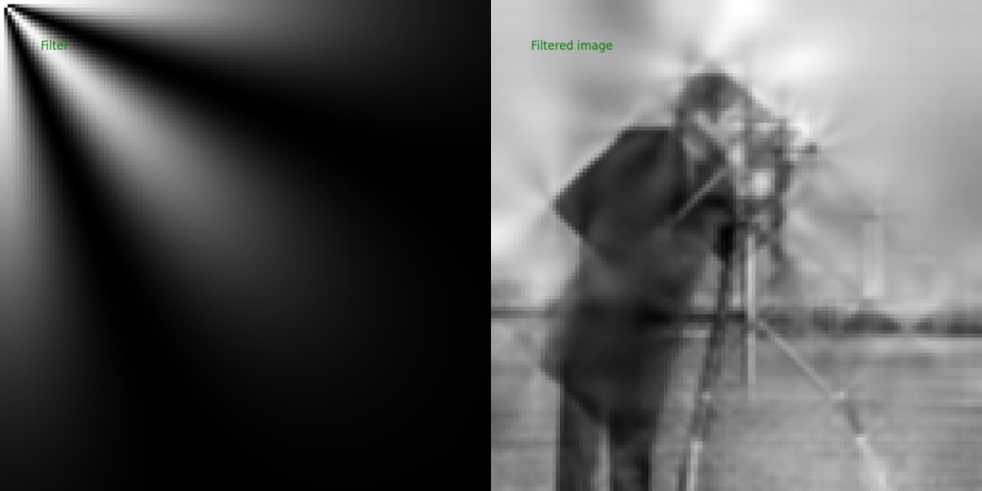 u, v = np.mgrid[0:N1, 0:N2]/max(N1, N2)r = (u**2 + v**2)**0.5theta = np.arctan2(v, u)H = np.exp(-3*r**2)*(np.cos(4*2*theta)/2 + 1/2)image__ = iDCT2D(H*IMAGE)Hx__ = np.array([H, abs(image__*0.5 + 0.5)])panel(Hx__, (2, 1), text_color='green',texts=['Filter', 'Filtered image'])
