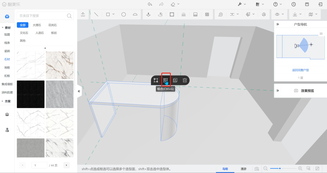 按住shift,双击鼠标左键,选择【组合】,对吧台进行打组。