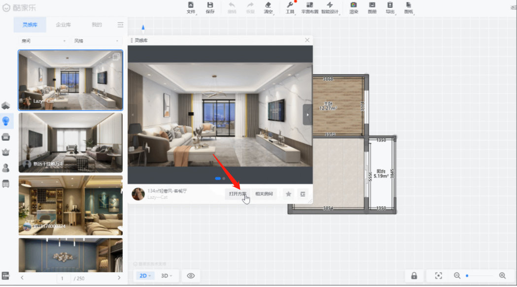 灵感库中的优秀样板间方案可以直接【打开方案】,将优秀方案复制过来,自己再进行调整